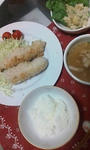 夕飯は鶏笹身のフライ(チーズ巻きと梅じそ巻き)、アボカドと蟹のポン酢あえ、エリンギとベーコンのスープでした。