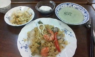 パエリアと甘酢和えとほうれん草のポタージュ。あとはデザートにゼリー。