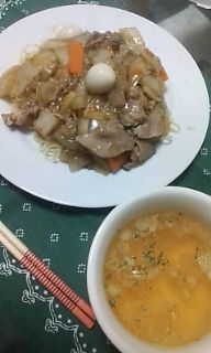 揚げた麺で作るのも好きですが、今日はソース焼きそばの麺を買ってきて麺だけ使いました。