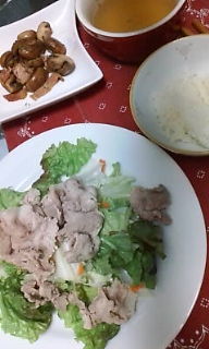 夕飯は豚しゃぶ(サラダ仕立て)、マッシュルームとベーコンのバターソテー、コンソメスープでした。