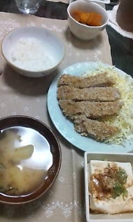 夕飯は豚カツ、かぼちゃの煮付け、冷や奴、ジャガイモの味噌汁。
